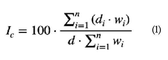 Although table 1 does not show it in detail, it can be seen that each of the ten criteria (n = 10) is divided into five levels or degrees of criticality (di), each of which represents the extent to which the failure of the element analysed has importance as far as the criterion in question is concerned. Following the method presented (Gómez de León y Ruiz, 2006), the criticality index (Ic) of each element is calculated by applying equation (1), where d is the maximum value that can be reached with a criterion. As seen in table 1, in this case d = 4: (1)