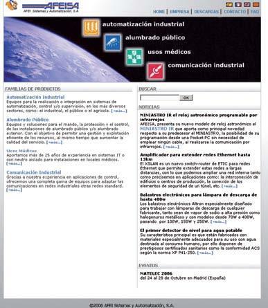 Afei Sistemas y Automatización ha presentado la nueva versión de su Web www.afeisa.es, totalmente renovada y actualizada, donde se muestran sus productos, así como las últimas novedades y noticias. En esta página Web se encuentra información sobre las siguientes cuatro familias de productos: Equipos para la automatización industrial y el telecontrol. Sistemas para el control, mando y protección del alumbrado público. Detectores y transformadores de aislamiento para las instalaciones en locales de usos médicos. Conversores, amplificadores y módems, para aplicaciones con redes de comunicación industrial. Destaca también el menú de descargas, donde se puede acceder, además de a los folletos de cada producto, a los manuales de usuario y a otros documentos técnicos, así como al software de acceso gratuito que permite la programación o configuración de nuestros equipos. Su estructura es sencilla y modular y permite un acceso rápido y ágil a la información sobre empresa y productos, y visualizar en la pantalla inicial las últimas noticias y eventos en que la empresa participa. Además, ésta ha presentado el catalogo del reloj astronómico Miniastro, especialmente indicado para el mando automático de cualquier elemento que requiera su encendido y/o apagado, en función del día o la noche, así como de un horario. También se incluye el Miniastro Ir, que como principal ventaja ofrece su programación por puerto infrarrojo desde una Pocket PC sin necesidad de conectar ningún cable. En el catálogo se detallan sus cuatro principales ventajas que son: máxima precisión y ahorro de energía, tres salidas independientes para el mando de la instalación, calendarios personalizados a las necesidades de cada usuario, y su sencilla programación por teclado. Destaca también la garantía de una programación estandarizada por zonas o tipologías de las instalaciones, y sus mayores prestaciones respecto al resto de equipos del mercado. Finalmente se indican algunas aplicaciones, remarcando las funcionalidades que pueden aportar unas mejores prestaciones o una mayor calidad de servicio al usuario de estas instalaciones.