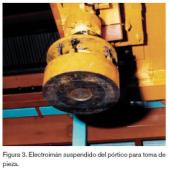 - Pórtico (figura 1), que efectúa los desplazamientos de búsqueda de pieza para tomarla posteriormente por la acción de la fuerza de un electroimán colgado en la cabeza-brazo del pórtico (figura 3), cuyo cálculo veremos posteriormente.