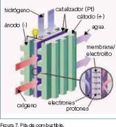 Las pilas de combustible (figura 7) son un medio de restablecer la energ?a gastada para producir hidr?geno mediante electr?lisis del agua. La oxidaci?n-reducci?n entre el hidr?geno y el ox?geno es una reacci?n simple que se produce dentro de una estructura formada por dos electrodos (?nodo-c?todo) separados por un electrolito.