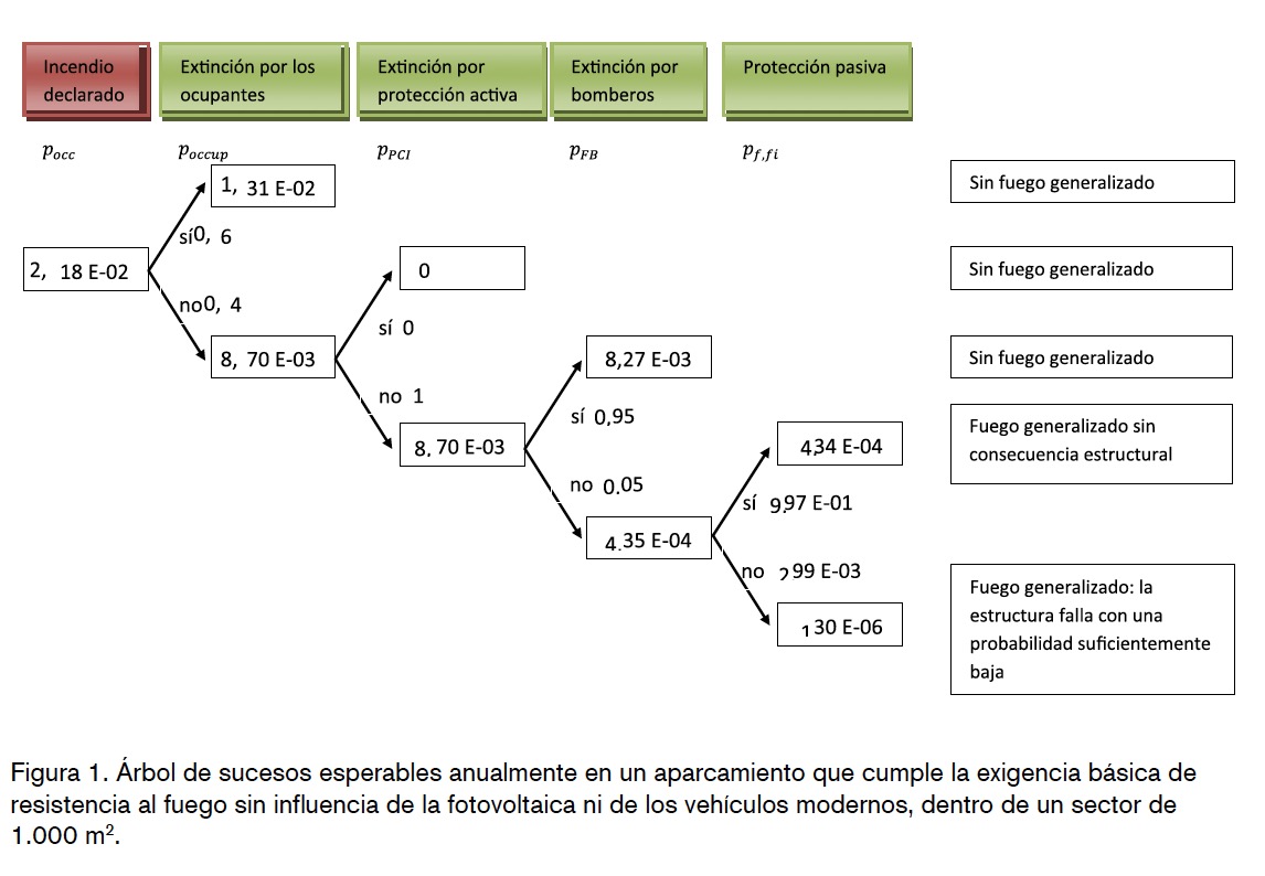 Para verificar que la fiabilidad ofrecida por la normativa es suficiente, ya se realizó un análisis retrospectivo. Como resultado se obtuvo la secuencia de sucesos que conducen a un incendio completamente desarrollado. En la verificación se utilizaron datos estadísticos y a cada evento se le asignó una probabilidad (Schleich, et al., 2002). Sin embargo, es importante destacar que en estos análisis no se tuvieron en cuenta ni las instalaciones fotovoltaicas ni los vehículos con las características que presentan hoy (figura 1).