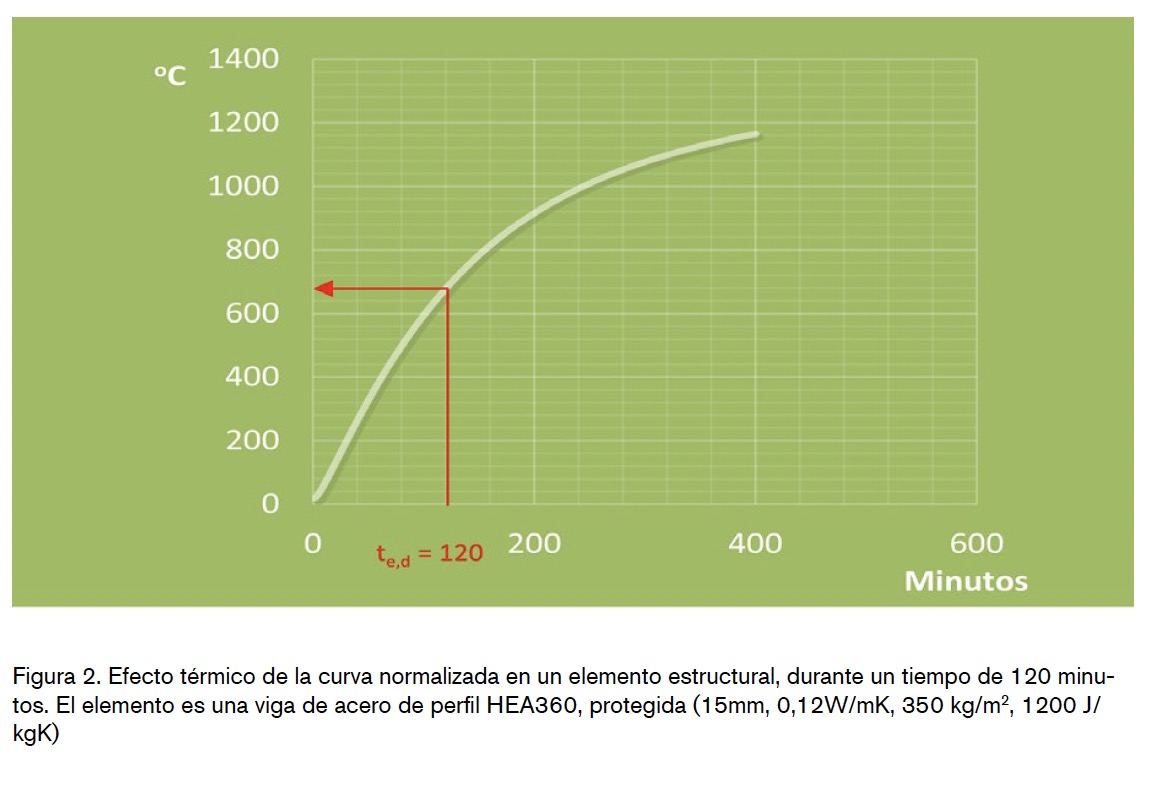 Para determinar el efecto térmico del incendio en los elementos estructurales, frente a los complejos modelos de fuego natural, se planteará la utilización del procedimiento del tiempo equivalente de exposición al fuego (CEN, 2019). Este enfoque facilita su aplicación práctica y permite obtener resultados que se presuponen conformes con las exigencias básicas reglamentarias (Ministerio de Fomento, 2019) (figura 2).