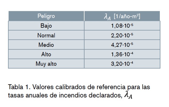 La incorporación de las instalaciones fotovoltaicas en la cubierta de un edificio, cuando los techos no consiguen sectorizar (por ser el escenario más desfavorable), tendrá una influencia para la seguridad estructural en caso de incendio que será analizada con la variación del riesgo y del tiempo equivalente de exposición al fuego que debería ser requerido. Con el objetivo de comparar un escenario de fuego con y sin influencia de las nuevas tecnologías, en primer lugar, se aplicará el método para obtener los valores calibrados de referencia para las tasas anuales de incendios declarados ?? asociando, así, los valores característicos a las actividades que la normativa vigente define para el interior de las edificaciones, sin la presencia de instalaciones fotovoltaicas y sin la repercusión de los nuevos vehículos. El cálculo se llevará a cabo obligando a que el índice I? sea igual a la unidad, tomando como referencia un escenario de fuego con una superficie de sector igual a 25 m2 , sin instalaciones de protección contra incendios y para los diferentes niveles de peligros de interés, utilizando la misma información estadística que la recomenda da para su aplicación en los estudios de fuegos naturales (Schleich, et al., 2002) (tablas 1-3). Para comparar el riesgo con y sin fotovoltaica, considerando inalterable el producto
