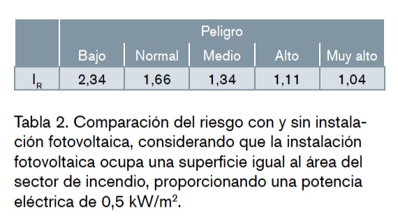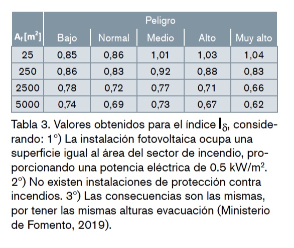 Se observa en la tabla 2 que la fotovoltaica tiene una influencia más relevante cuanto menor es el peligro inicial, y es muy significativo el aumento en las actividades que inicialmente tienen un peligro medio o inferior. Por otra parte, con el índice se analizará cuál es el impacto de la instalación fotovoltaica en la resistencia al fuego requerida, debido a la influencia en el inicio y el crecimiento del incendio.