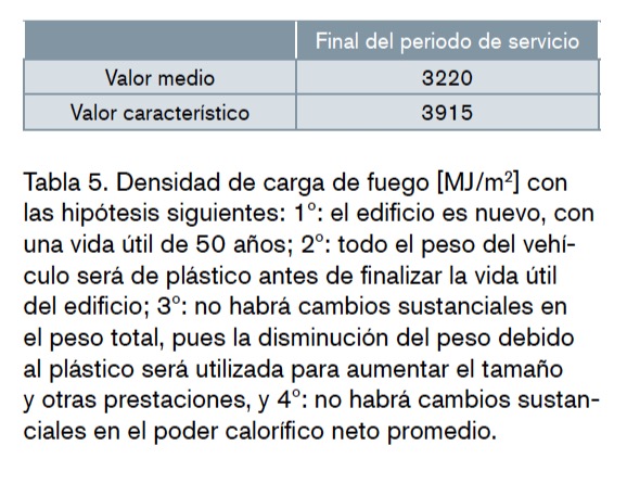 Ahora bien, gran parte del impacto pronosticado de los nuevos vehículos en los aparcamientos encuentra su justificación en los valores tan significativos que muestran el producto de con , especialmente debido al índice , que permite relativizar la importancia de algunos factores, como pueden ser las baterías de los vehículos y los puntos de recarga, para resaltar la fuente principal del problema: la tendencia al aumento de la acumulación de energía a disposición del fuego, a causa del aumento del peso en plástico en los vehículos.