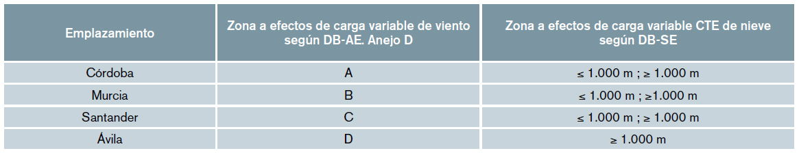 Para el estudio del pórtico tipo a distintas luces y emplazamientos, se considerará una nave de 25 m de profundidad y una separación entre pórticos de 5 m. El pórtico objeto de estudio se ha ubicado en distintas zonas geográficas de España, así como en distintas cotas sobre el nivel del mar; en la tabla 1 se relacionan las zonas consideradas.