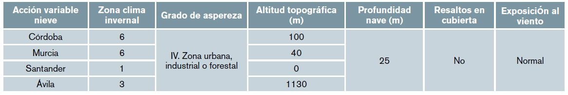 Los parámetros de cálculo de las acciones variables de nieve a las que se someterá el pórtico según DB-AE del CTE, se detallan en la tabla 4.