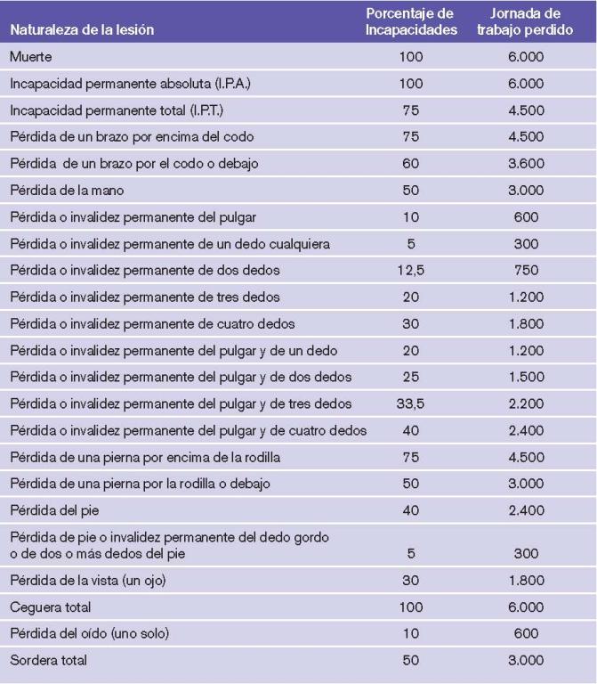 En las jornadas laborales perdidas no están incluidas las correspondientes a accidentes con incapacidad permanente, ni las correspondientes a los accidentes sin baja. Según baremo oficial (tabla 2), a la pérdida de la mano corresponden 3.000 jornadas de trabajo perdidas, y a la pérdida o invalidez permanente de un dedo cualquiera (excepto el pulgar) corresponden 300. A una muerte le corresponden, por baremo, 6.000 jornadas de trabajo perdidas.
