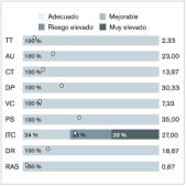 En función de estos valores, los factores principales de acción son en ITC (interés por el trabajador/compensación), situado en la zona roja con “Riesgo muy elevado” y PS “Participación/Supervisión”, situándose en zona amarilla o “Mejorable”, lo que puede, en el caso de este último factor, buscar oportunidades de mejora una vez establecidas las prioridades por orden de importancia.
