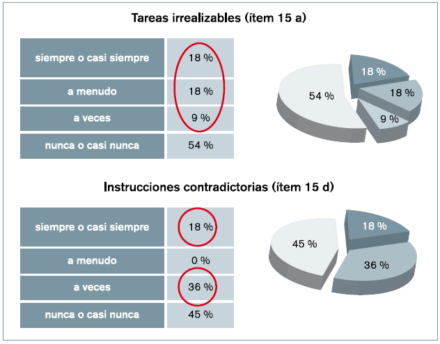 Además, cabe destacar que aunque el factor DR (Desempeño de Rol) está situado en zona amarilla o “Adecuado” en su resultado global, los ítems pertenecientes a Tareas Irrealizables (ítem 15a) e Instrucciones contradictorias (ítem 15d), pueden reflejar la existencia del origen de algún problema y deberá ser estudiado (figura 5).