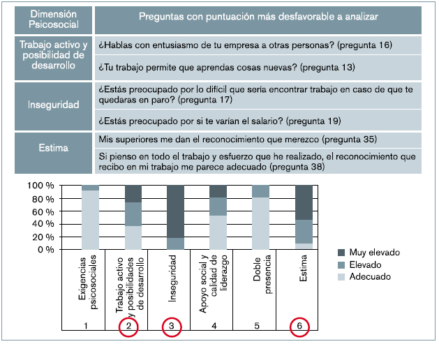 El estudio del método ISTAS21 (CoPsoQ) se realizó utilizando la primera versión por no estar publicada aún la versión segunda. La figura 6 muestra un resumen de las dimensiones psicosociales peor valoradas junto con las preguntas responsables de ello.