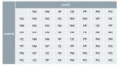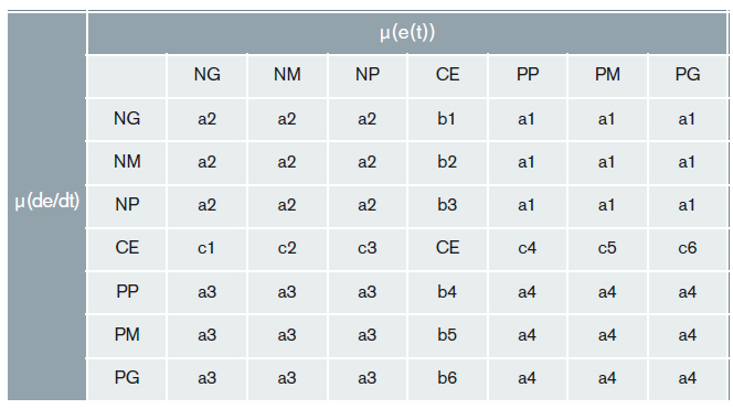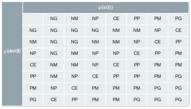 Por ejemplo: [PP∈(μ(e(t))]∩[NG∈(μ(de/dt))]⇒(Inferior a P no puede haber (no es posible), pero inferior a G sí es posible, y es M). Por tanto, la salida es NM.