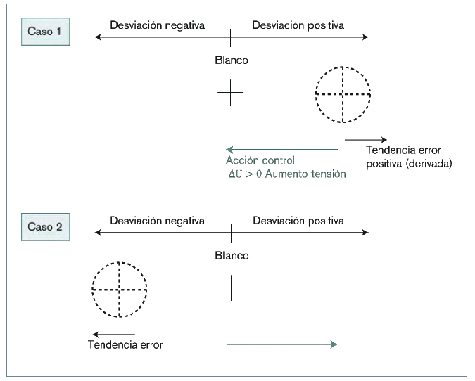 Suponiendo que el blanco está en el centro, se entenderá que una desviación (error) es positiva si el cañón va hacia la derecha y negativa hacia la izquierda. Así la tendencia (derivada del error) llevará el mismo criterio cartesiano.