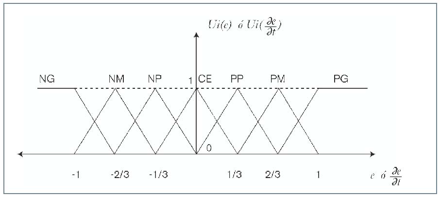 De este análisis empírico se podrán interpretar los ai, bi y ci {∀i∈[1,6]} como rasgos heurísticos, lo cual da origen a variables difusas definidas para una función de pertenencia μ(e) y otra μ(de(t)/dt). Sean estas variables difusas: