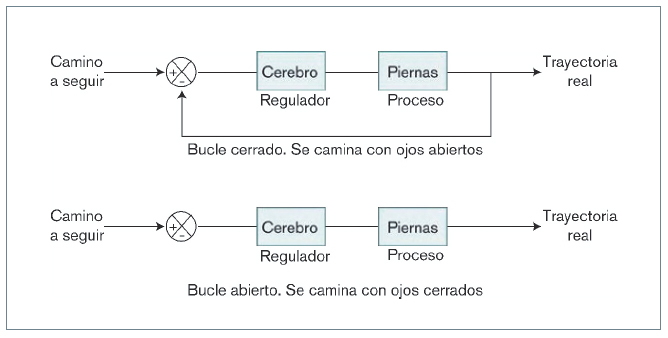 Se parte de que un sistema o cualquier otro sistema podría funcionar como ocurre cuando se camina. Si se hace con los ojos cerrados, se está ante un lazo de control abierto, ya que no se rectifica la trayectoria en caso de desvío. Sin embargo, si se hace con los ojos abiertos se puede rectificar la trayectoria en caso de desvío y, por tanto, será un lazo cerrado (figura 2).