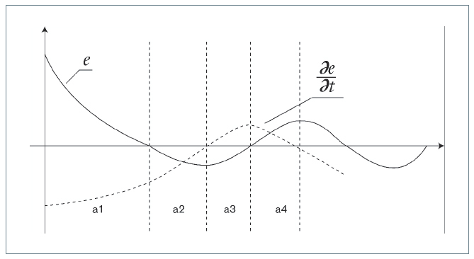 3) Si e(t) no está tendiendo a cero, la acción de control dependerá del signo y magnitud de e(t) y (de(t))/dt. En zona a2 ∆U < 0 se reduce tensión y en zona a4 ∆U > 0, se añade tensión.