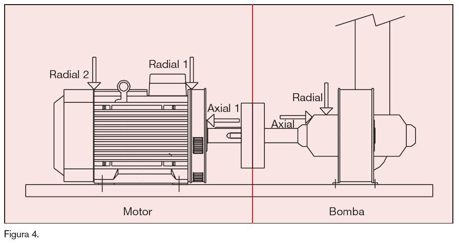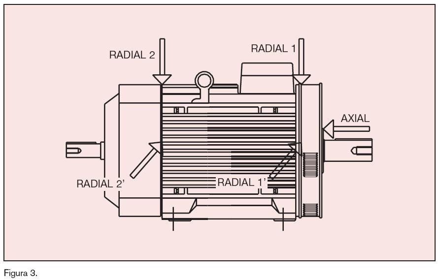En los motores (figura 3), tanto horizontales como verticales, se deben tomar, siempre dentro de nuestras posibilidades, dos mediciones radiales (perpendicular al eje) y una axial (paralela al eje), en ambos extremos del motor, es decir, a ambos lados del eje del rotor; aunque a veces, con sólo una medida radial en cada lado, se pueden detectar también los fallos existentes.