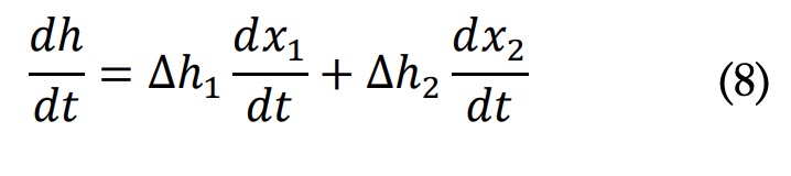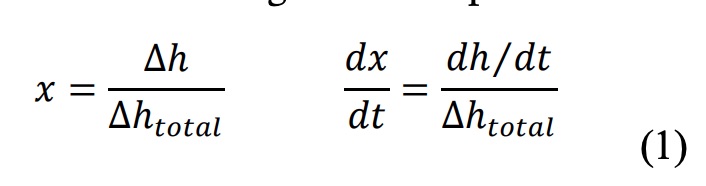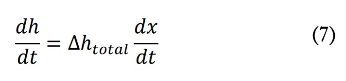 Donde ?h es el calor liberado hasta un cierto instante (experimento isotérmico) o temperatura (experimento dinámico), dh/dt es el flujo de calor liberado de manera instantánea, y ?htotal corresponde al calor total liberado en el proceso de curado en los experimentos dinámicos e isotérmicos, asumiendo que el curado sea completo en cualquier caso.