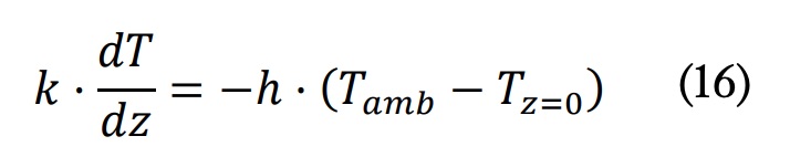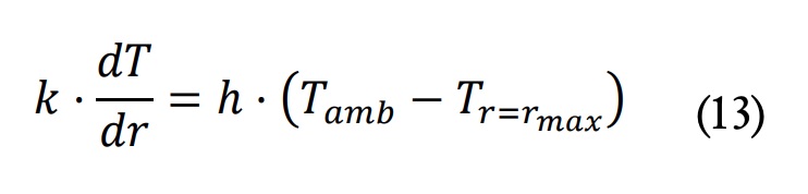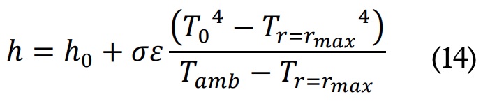 Donde Tamb es la temperatura del aire del entorno, Tr=r_max es la temperatura superficial y h es un coeficiente de convección-radiación que se calculó como: