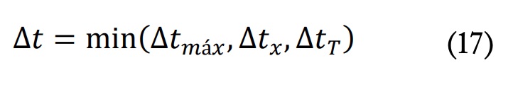 Donde ?x máx y ?T máx son un valor máximo permitido de incremento de conversión y temperatura, respectivamente, dx/dt se evalúa a partir de la velocidad de reacción en todos los nodos donde hay resina reactiva, y dT/dt se evalúa utilizando la ecuación (5) de manera explícita en todos los nodos del sistema.