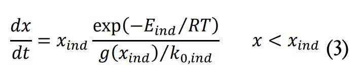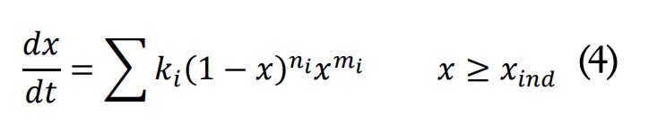 Donde Xind es un grado de conversión correspondiente al periodo de inducción ficticio, con un valor de 0,01. Los parámetros Eind y g(xind )/k0,ind se han determinado para el grado de conversión x=xind=0,01 mediante análisis isoconversional integral no lineal utilizando información isotérmica y dinámica [3,17]. Pasado el periodo de inducción, el curado se ha modelizado mediante las siguientes expresiones:
