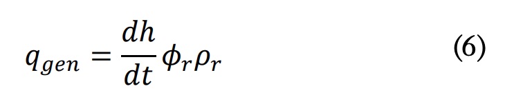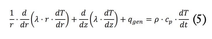 Donde ?, ? y cp son la conductividad térmica efectiva, la densidad y la capacidad calorífica específica, respectivamente, y T es la temperatura. Se ha supuesto insignificante la resistencia a la transferencia de calor entre la resina y las fibras de refuerzo. La dirección transversal está indicada por la letra z y la radial mediante la letra r. Debido a la simetría cilíndrica no aparece el ángulo de revolución e . En la expresión, el término qgen es el calor generado por unidad de volumen y solamente está presente en los elementos donde se encuentra la resina y la resistencia calefactora. En el caso de la generación de calor correspondiente al curado de la resina, se puede expresar como: