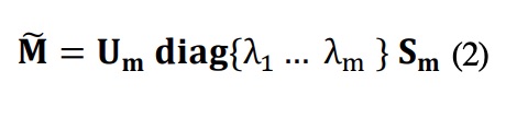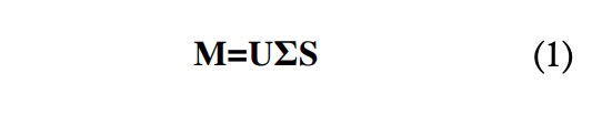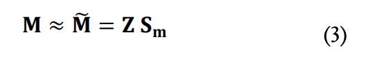Donde U es una matriz de columnas ortonormales en la que UtU=I, S es una matriz de filas ortonormales en la que SSt , ? es una matriz diagonal que contiene los valores singulares ordenados de mayor a menor (?1 ? ?2 ? … ?18?0). Por tanto, la matriz M puede ser aproximada a otra matriz ?? reducida en dimensiones, reemplazando la matriz ? por ?m que contiene los mayores m valores singulares ?1 … ?m. En consecuencia, la aproximación quedará: