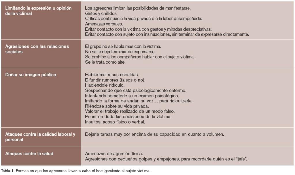 El sujeto-víctima no tiene ningún apoyo dentro del LCP (aun teniendo conocimiento de lo que ocurre) y comienza a verse sometido a todo tipo de hostigamientos verbales (insultos), incomunicación por parte de los compañeros, obstaculización del trabajo, etc.… En la tabla 1 pueden verse resumidos los diferentes tipos de formas en que los agresores llevan a cabo los acosos u hostigamientos al sujeto-víctima.