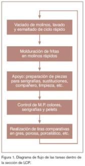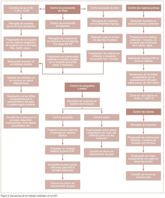 Los controles de calidad de producción de fabricación de fritas se hacen en 3 horas distintas: a las 8:00, a las 11:00 y a las 14:30. Los controles de colores, materias primas, “pelets” suelen hacerse a lo largo de toda la jornada. Las secuencias de trabajo se han esquematizado en el diagrama de flujo de la figura 2.