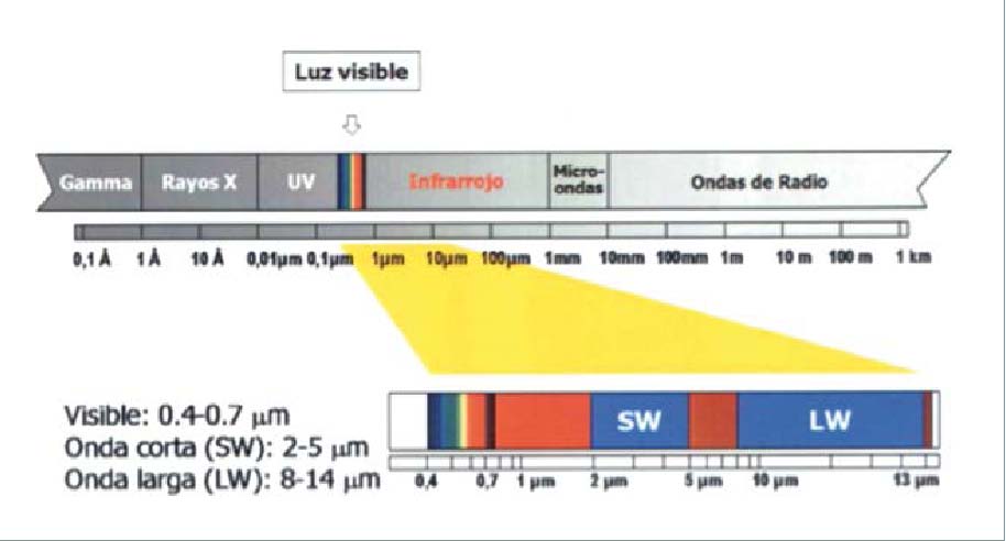 Actualmente, dentro del espectro infrarrojo, que se sitúa aproximadamente entre los 0,7 μm y los 1.000 μm (como se aprecia en la figura 3), las cámaras termográficas trabajan en me-nor medida con la onda corta (de 2 a 5 μm) y en mayor medida con la onda larga (de 7 a 14 m aproximadamente1).
