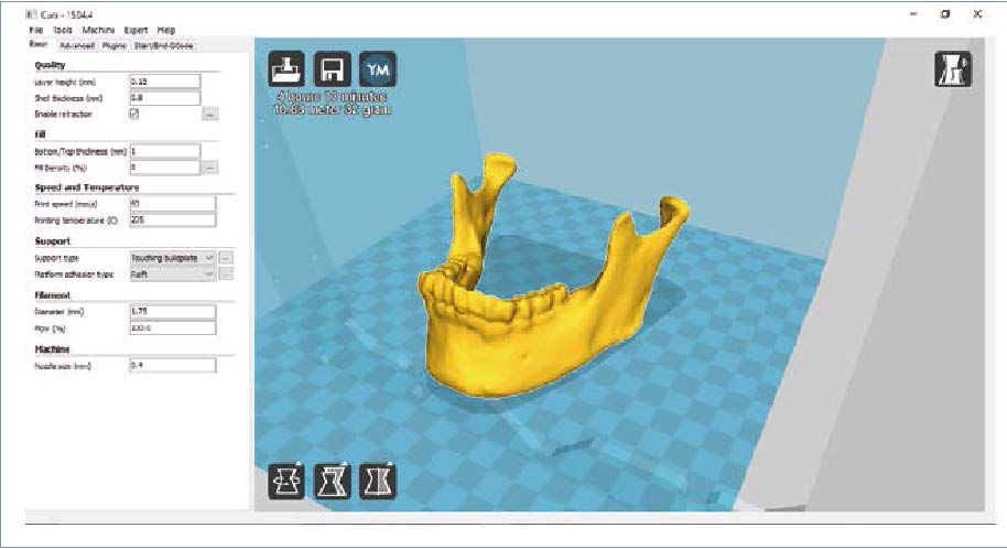 A partir del modelo obtenido se procedió a la fabricación aditiva (additive manufacturing) mediante la sucesiva superposición de capas micrométricas de un material polimérico. Empleamos el software Cura (de la casa comercial Utimaker), (figura 3), que nos permitió dividir en capas el mode-lo tridimensional, según un perfil de configuración optimizado. El proceso de laminado transfiere un diseño digital en 3D en formato STL (STereo Lithography) creándose unas capas delgadas en un plano de dos dimensiones que la impresora leerá. Tras apilar estas capas se crea el objeto. Este proceso se realizó mediante cálculos matemáticos por el software de generación de G-Code. Este código se genera de forma automática y podemos introducir modificaciones. Calculadas las trayectorias y generados los comandos, se transmite a la impresora y se inicia la creación las piezas anatómicas óseas.
