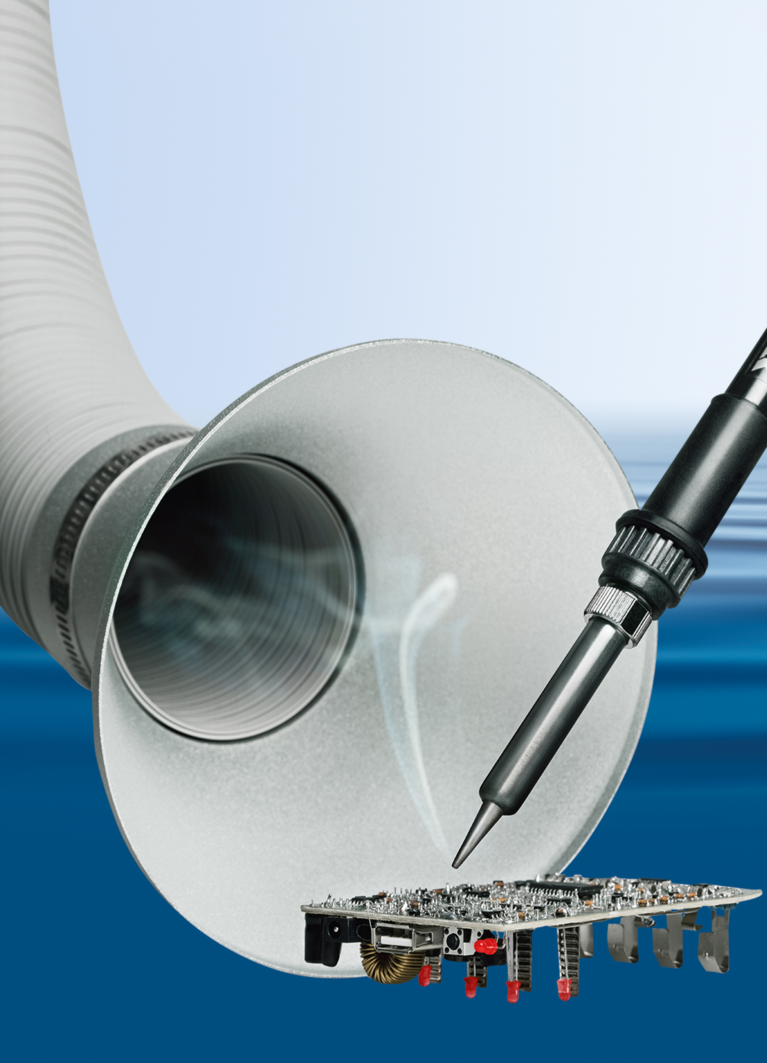 El potente motor de bomba exento de mantenimiento aspira de forma eficiente los vapores de soldadura del entorno del puesto de trabajo. A través de sendos tubos flexibles con una longitud de 250 cm y un diámetro de 75 mm, hasta dos embudos están conectados con la unidad base compacta que se puede integrar fácilmente debajo del puesto de trabajo. A pesar del alto rendimiento del sistema de aspiración, el nivel de ruido es inferior a 50 dB. Los vapores de soldadura aspirados se conducen a través de un sistema de filtro de tres etapas, compuesto de un filtro previo, un filtro HEPA y un filtro de carbón activo que retiene las sustancias tóxicas y el polvo fino respirable. Si es necesario, los filtros se pueden cambiar con unas pocas maniobras.