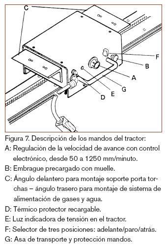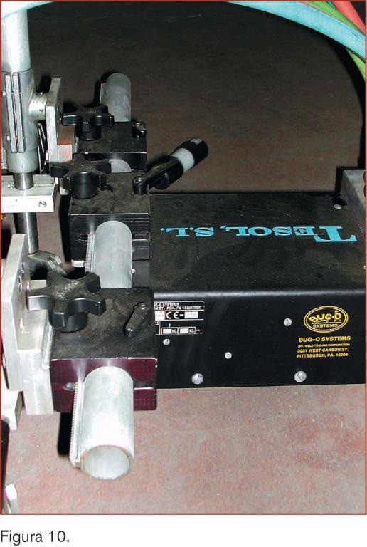En el ángulo delantero del tractor se dispone del sistema portatorchas, dotado de piñón de ajuste sobre cremallera dentada, para una colocación precisa de las antorchas. Sobre la cremallera dentada, de 500 mm de longitud, van montados los soportes de las torchas, dotadas de regulación a través de piñón dentado. (figura 10)