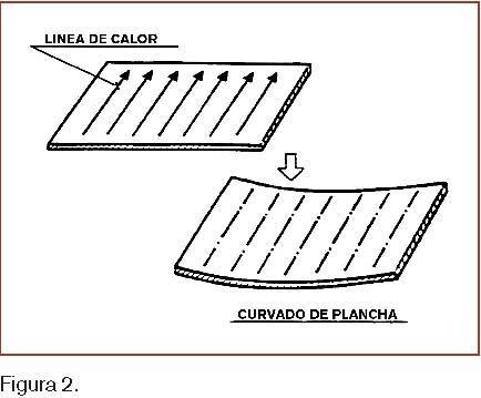 Si la aplicación del calor sobre una chapa, se realiza de forma lineal (figura 2), el efecto de deformación que se produce, se traduce en una distorsión angular respecto a la línea de aplicación del calor. De este modo si nosotros aplicamos calor sobre un determinado numero de líneas paralelas y equidistantes sobre una chapa, conseguimos el mismo efecto de curvado que se consigue empleando los rodillos de un cilindro.