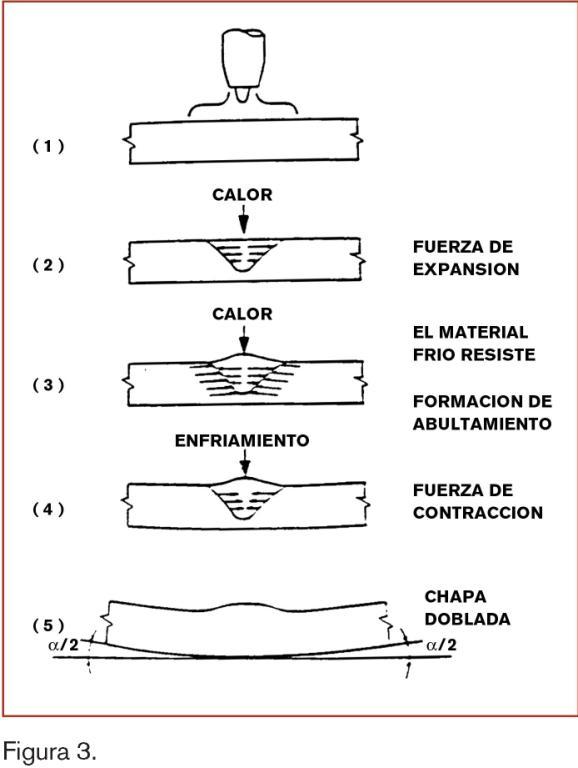 El material dilatado por el calor encuentra una oposición a desarrollarse en el sentido transversal a la línea de aplicación del calor, al ser obstaculizado por las zonas frías de la chapa.
