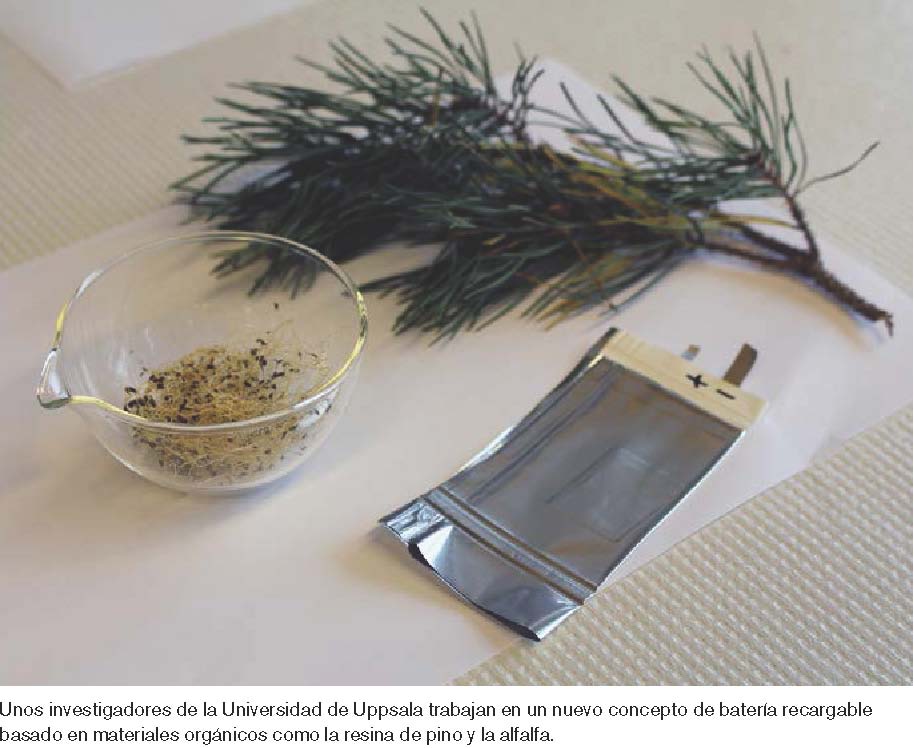 Unos investigadores del Laboratorio Ångström de la universidad sueca de Uppsala trabajan en un nuevo concepto de batería recargable basado en resina de pino y alfalfa. Estos acumuladores con biomateriales orgánicos renovables equiparan las prestaciones energéticas de las baterías de litio, aseguran los científicos. Además, esos materiales orgánicos se pueden reciclar al 99% con un bajo gasto energético y empleando sustancias como el etanol y el agua, que no representan un peligro químico. “Nuestro descubrimiento puede abrir varias puertas a nuevas soluciones de eficiencia energética con el medio ambiente para las baterías del futuro”, afirma Daniel Brandell, profesor titular en el departamento de Química de la Universidad de Uppsala y uno de los investigadores que están desarrollando esta idea.