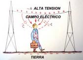 En las proximidades de líneas de alta tensión, como muestra la figura 2, se genera un campo eléctrico que actúa como el producido entre las placas de un condensador en el que una de sus placas o electrodo es la propia línea y el otro electrodo es el cuerpo de la persona que está en su proximidad y, lógicamente, esto ocurre aunque sobre la línea no circule corriente alguna, pues como sabemos el campo eléctrico sólo depende del potencial (U) de la línea y de su distancia (d) a la misma viniendo relacionadas por la expresión: