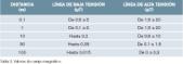En alta tensión se trabaja a 380 kV y en baja tensión a 400 V. Con estos valores trabajando a 50 Hz los campos eléctricos son más fáciles de apantallar sin grandes costes. Por el contrario, el campo magnético a esta baja frecuencia es más difícil de controlar y para realizar un apantallamiento eficaz hay que realizar mayores inversiones. En las tablas 2 y 3 tenemos representados, respectivamente, los valores que podemos medir tanto de campo magnético como de campo eléctrico a una determinada distancia.