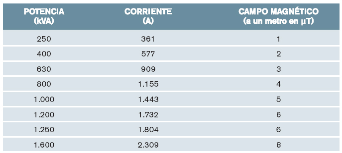 Es decir, en una subestación transformadora a dos metros de distancia podemos tener un campo magnético producido por el conjunto de conductores en función de la corriente del orden de 50 μT, al que habrá que sumar el producido por los transformadores presentes que si son de 1.000 kVA, fácilmente pueden dar valores superiores a los 60 μT, y su suma es superior al valor frontera de 100 μT.