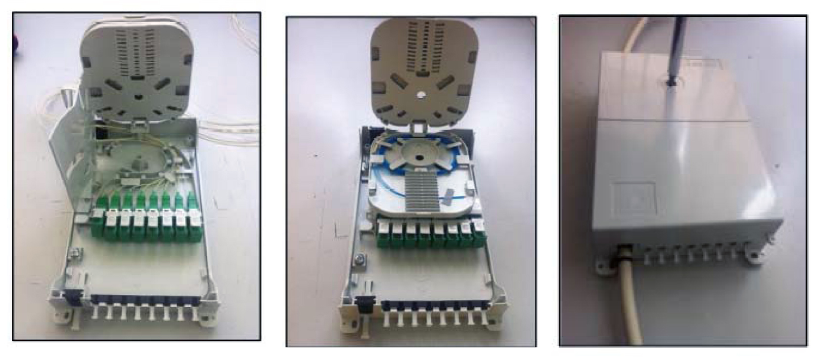 Este modelo permite alojar dos bandejas destinadas a contener hasta 48 empalmes de fibra y 8 conectorizaciones tipo SC en sus compartimentos diferenciados. También posibilita la entrada de hasta 8 cables de acometida preconectorizados con 2+2 entradas / salidas de cable raiser.