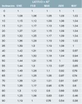 Según baremos del IDAE, la inclinación óptima de los paneles viene dada por su latitud, que puede variar en cada uno de ellos si la inclinación óptima es de 30º o 25º. Para ello, el IDAE facilita unas equivalencias como la de la tabla 3 en la que se observa una serie de valores divididos por latitudes. Dentro de cada latitud existen unos coeficientes de ganancia, divididos entre meses, que ha valorado el IDAE conforme a cada inclinación.