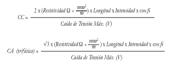 Para poder calcular el porcentaje de pérdidas por cableado, debemos realizar un cálculo eléctrico con previsiones de distancias y potencias, de modo que se pueda obtener un número real. En este caso, la normativa nos «invita» a no tener más de un 1,5% de caída de tensión en el cableado en corriente continua y el 2% en corriente alterna, se deberá elegir la sección de modo que el cable resista la intensidad máxima calculada. Sabiendo la corriente que circula por el cableado, su longitud de tramo y sus características, se calcula la sección para que no supere los valores de caída de tensión que indica el reglamento. Fórmulas utilizadas en corrientes continua y alterna: