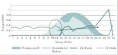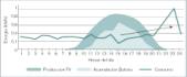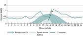 En la gráfica de la figura 5 se observa cómo podría ser la instalación de autoconsumo instantáneo y cuáles podrían llegar a ser los ahorros obtenidos aproximadamente, al igual que la cantidad de energía no aprovechada de la instalación. Partiendo de este fenómeno, se procede a la gráfica de la instalación fotovoltaica asistida, añadiendo el componente de acumulación y verificándose el traslado de parte de la curva de producción a horas nocturnas (figura 6).