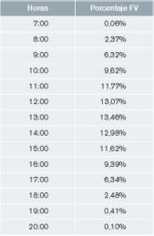 Utilizando varios datos reales de instalaciones fotovoltaicas en la zona, se obtiene el siguiente porcentaje de producción de energía por horas (tabla 1).