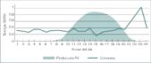 En este apartado se trata de optimizar al máximo la combinación de la tarifa DH con la producción de la fotovoltaica asistida, de manera que las horas de producción solar que coinciden con el horario valle de la tarifa sirvan para almacenar en baterías toda la energía posible, utilizándola en horario punta de la tarifa. De este modo, aumentaríamos la eficacia de esta simbiosis. Esto se consigue desplazando la curva de consumo directamente de baterías y fotovoltaica hacia las horas punta, como se aprecia en la siguiente gráfica: