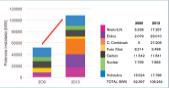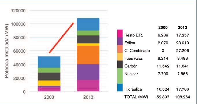 Por otra parte, el sector eléctrico está sobredimensionado en España, pues la capacidad de producción energética española es más del doble del consumo récord en nuestro país. Actualmente, España cuenta con una potencia instalada de 108.264 MW (de los cuales más de la mitad son gestionables e independientes de la meteorología), lo que supone que en 2013 existía más del doble de MW instalados que en 2000, con 52.397 MW (figura 2). Estas cifras no aportan nada por sí mismas, pero hay que tener en cuenta que la demanda máxima que se ha registrado fue de 44.800 MW a las 8 p.m. del 17 de diciembre de 2007 (REE). Según los datos de la REE, el margen de reserva ante incrementos no calculados de demanda debe ser superior a 1,1, es decir, el 10% superior a la demanda punta obtenida hasta el momento; por tanto, si tenemos en cuenta este 10%, la potencia que debería haber instalada para garantizar la seguridad del sistema sería de 49.280 MW gestionables, muy por debajo de los más de 100.000 MW actuales; se debe tener en cuenta que parte de la potencia instalada procede de fuentes no gestionables (en su mayoría de la eólica) y, por tanto, muy dependientes de la meteorología; en consecuencia, suponiendo un margen de reserva mucho mayor (50%) la potencia instalada sigue siendo muchísimo más elevada que la necesaria (67.200 MW)