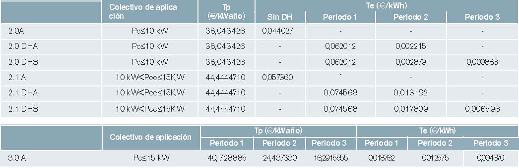 Actualmente, lo que se ofrece son distintas tarifas que varían en función del nivel de tensión y la discriminación horaria: tarifas de acceso en uno, dos y tres periodos tarifarios en baja tensión (< 1kV), tres y seis periodos tarifarios en media tensión (1-36 kV) y seis periodos tarifarios en alta tensión (> 36 kV). A su vez, en baja tensión se divide, según la potencia contratada en tres escalones: < 10 kW, 10-15 kW y > 15kW.
