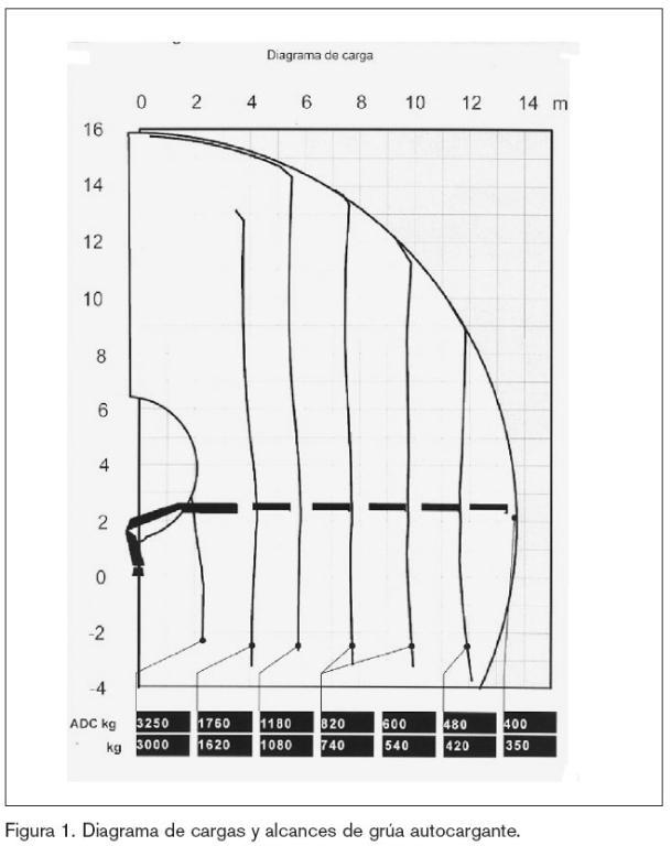La grúa autocargante Hiab 088 E-5 Hiduo con una capacidad de elevación de 7,2 toneladas-metro y alcance máximo de 13,7 metros, dispone de un diagrama de cargas y alcances que es controlado por un limitador electrónico que se ha ajustado a las condiciones de uso en las pruebas finales de estabilidad sobre el equipo de trabajo. En esta regulación del limitador se ha tenido en cuenta el efecto del trabajo de la grúa solamente y el efecto conjunto con la plataforma móvil aérea de personal.