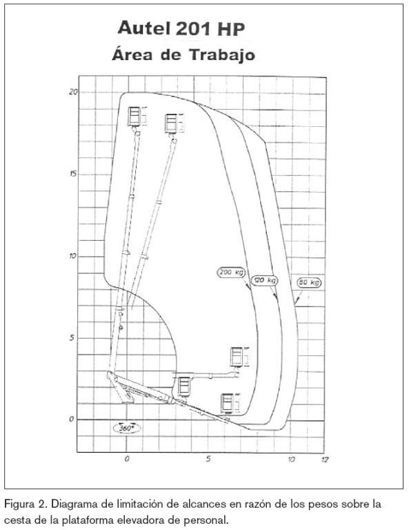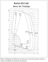 La plataforma elevadora de personal Bizzocchi Autel 201 HP con un diagrama de alcances que depende del peso sobre la cesta (200 kg, 120 kg o 80 kg) es controlado por un limitador electrónico que se ha ajustado a las condiciones de uso en las pruebas finales de estabilidad sobre el equipo de trabajo. En esta regulación del limitador se ha tenido en cuenta el efecto del trabajo de la plataforma solamente y el efecto conjunto con la grúa autocargante.