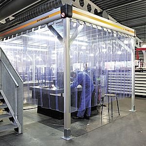 La campana se puede colgar del techo con los ojos de elevación integrados o montarse sobre las patas de aluminio. La versión XL tiene refuerzo adicional en las esquinas para garantizar una instalación firme. Las láminas de soldadura resistentes a chispas son un accesorio muy importante y pueden utilizarse para aislar una zona de trabajo. Son de alta calidad, están fabricadas con material plástico térmico y se pueden cortar en tamaños específicos, según sus necesidades. Las láminas no sólo protegen a los soldadores que están dentro, sino que también protegen de la luz de soldadura a las personas que trabajan en las proximidades.